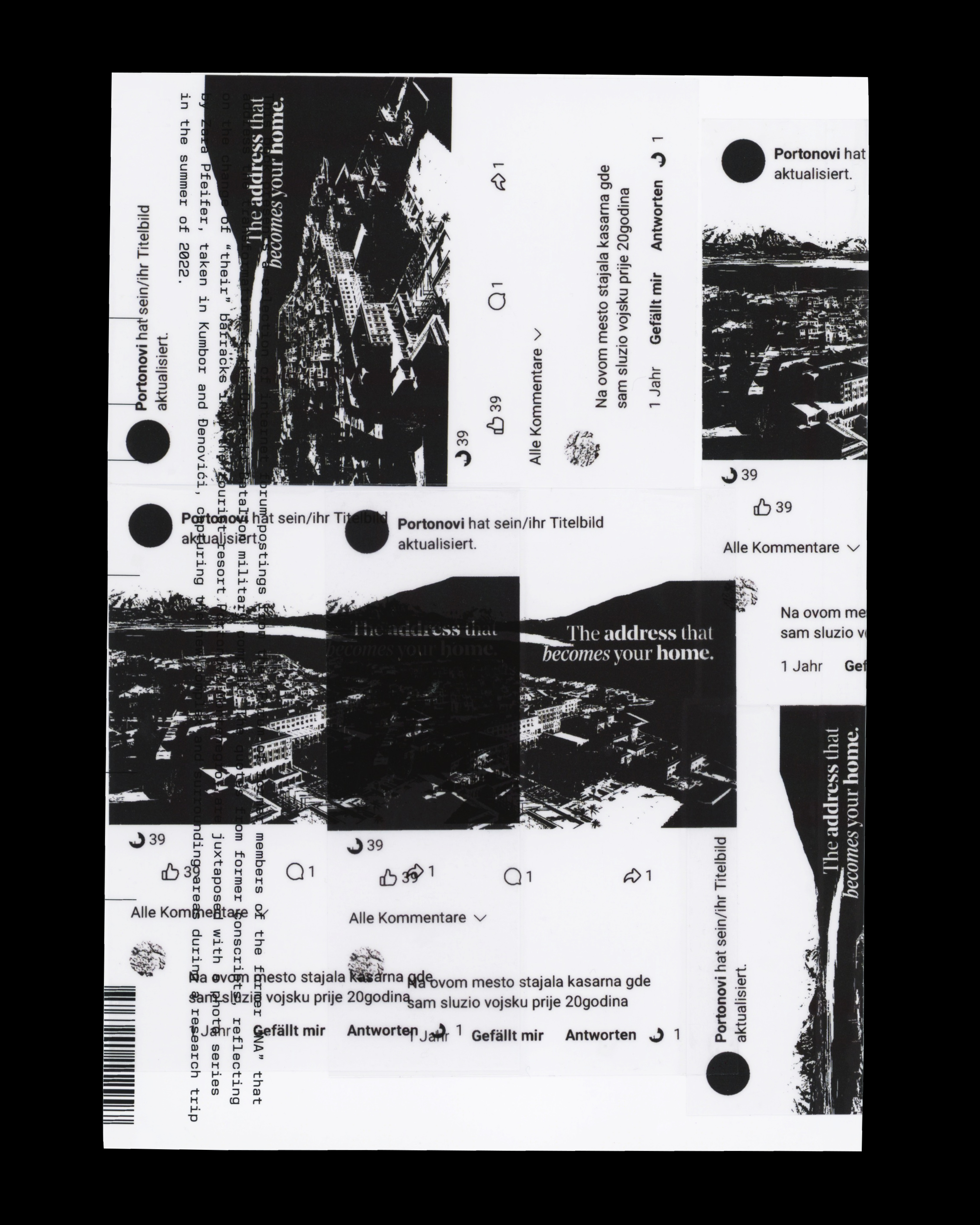 The book presents a selection of internet forum postings from the 'Forum of the former JNA Members', addressing the transformation of the Orjenski Bataljon military complex. Contrasted with these are the photographs by artist Zara Pfeifer, taken in Kumbor and Đenović, which document the complex transformation of the architecture. These two distinct perspectives are set in opposition and organized within a clear, structured grid.